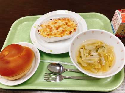 今日は、黒砂糖パン、マカロニグラタン、白菜スープ、牛乳です。