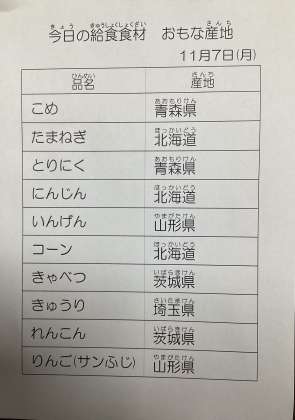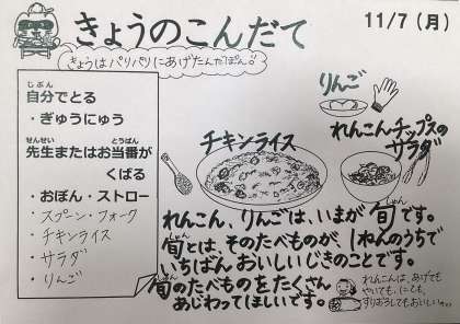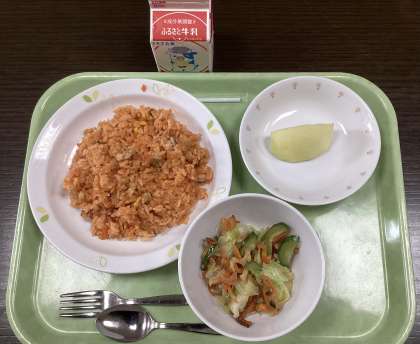 今日は、チキンライス、れんこんチップスのサラダ、りんご、牛乳です。