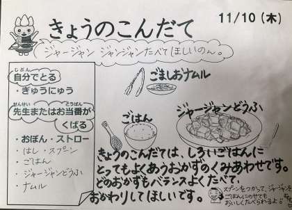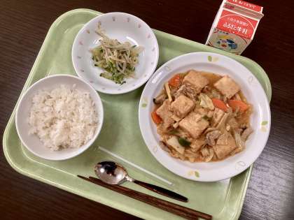 今日は、ごはん、ジャージャン豆腐、ごま塩ナムル、牛乳です。