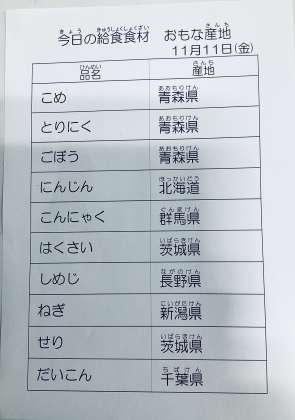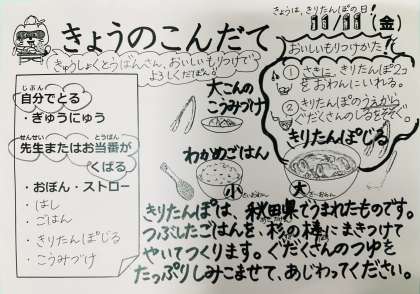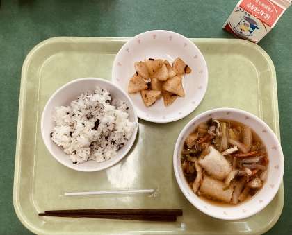 今日は、わかめごはん、きりたんぽ汁、大根の香味漬け、牛乳です。