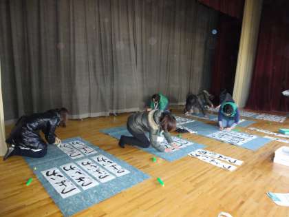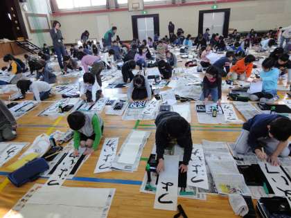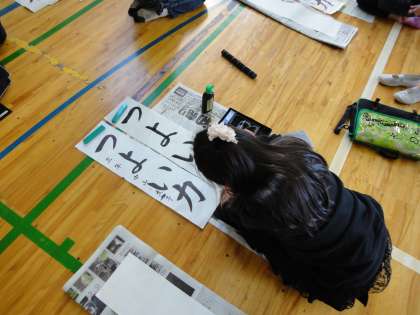 書き初め会の始めに、担当の先生から「『集中して』『心をこめて』書くことを頑張りましょう。」というお話がありました。子ども達は静かに話に耳を傾け、書き初め会への気持ちを高めていました。
