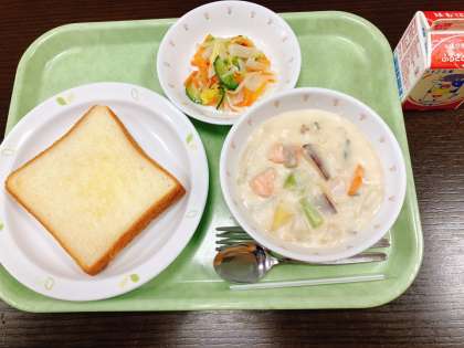 今日は、バタートースト、秋鮭のクリーム煮、フレンチサラダ、牛乳です。