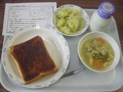 今日の給食は、ココアトースト、牛乳、ヌードルスープ、パセリポテトです。