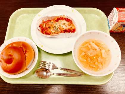 今日は、黒砂糖パン、ペンネミートグラタン、ジュリアンスープ、牛乳です。