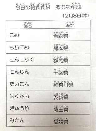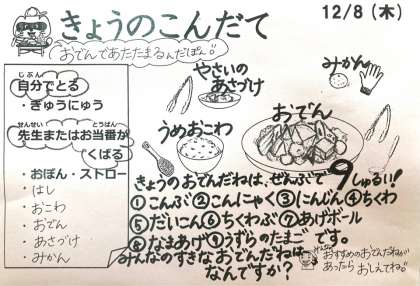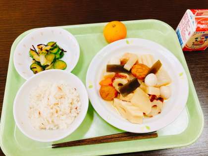今日は、梅おこわ、おでん、野菜の浅漬け、みかん、牛乳です。