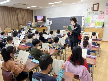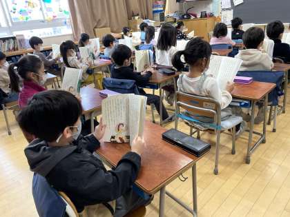 先生が「おかゆのおなべ」というお話を読んでいました。子供たちは、教科書を両手で持って、目で文章を追いながら聞いていました。先生が読む声を目と耳と心で聞いていることが、姿勢から伝わってきました。