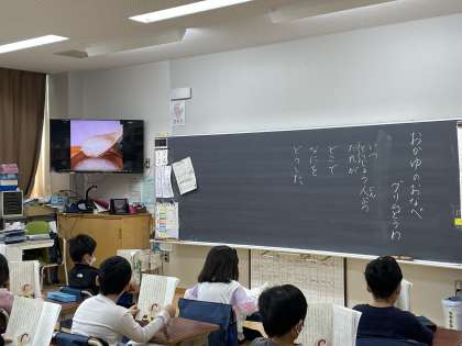 テレビにはおかゆの画像が映り、黒板には何を気を付けて聞くのが書かれていて、学習のねらいが分かりました。