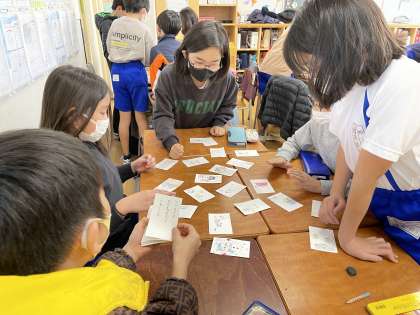 かるたをしていました。自分で作った冬にまつわるかるたです。読み札に合わせた絵がかわいらしくてすてきでした。