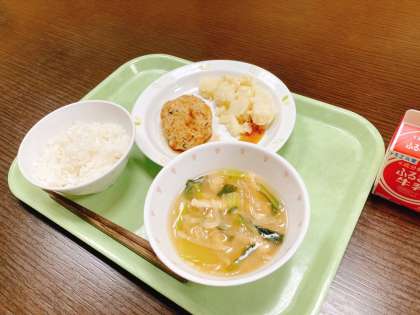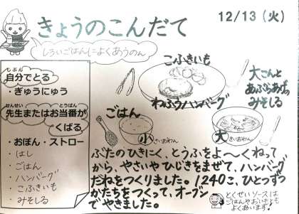 今日は、ごはん、和風ハンバーグ、粉ふきいも、大根と油揚げのみそ汁、牛乳です。