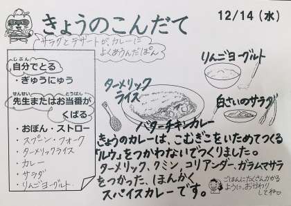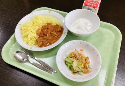今日は、ターメリックライス、バターチキンカレー、白菜のサラダ、りんごヨーグルト、牛乳です。
