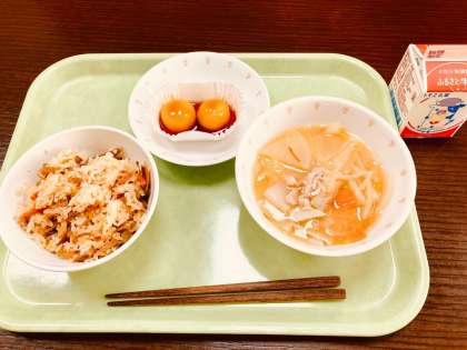 今日は、きんぴらおこわ、豚汁、かぼちゃのなかのくにのおだんご、牛乳です。