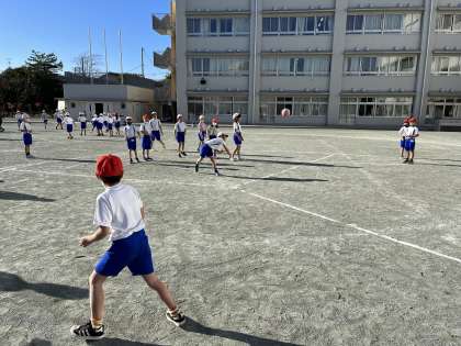 元気いっぱいの2年生が、明日のドッジボール大会に向けて練習試合をしていました。