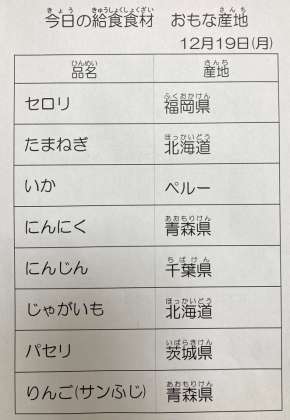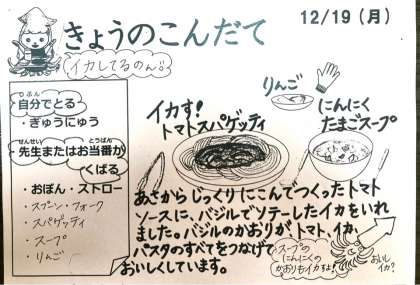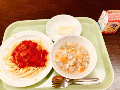今日は、イカす!トマトスパゲッティ、にんにく玉子スープ、りんご、牛乳です。