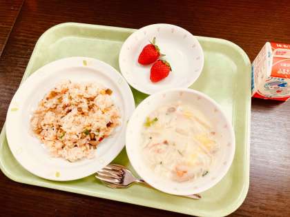 今日は、鶏ごぼうピラフ、米粉の白菜クリーム煮、いちご、牛乳です。