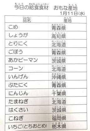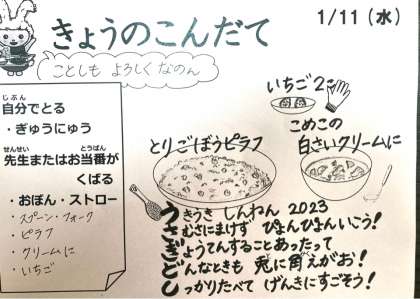 今年最初の給食です。鶏ごぼうピラフの給食を、一人もとりごぼうし無く全員が食べられるようにとの栄養士の先生の気遣いで、グルテンフリーになっています。米粉の白菜クリーム煮が、とても優しい美味しさに感じられます。