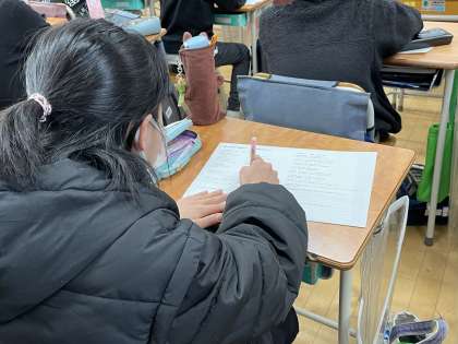 卒業式で歌う歌の歌詞の中から共感できる部分やいいなと思う部分を見つけ、どのような思いを込めて歌いたいか考えました。6年生にとって一つ一つのことが、自分自身を見つめたり、小学校生活を振り返ったりと、感慨深いものになっているのでしょう。
