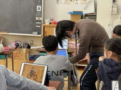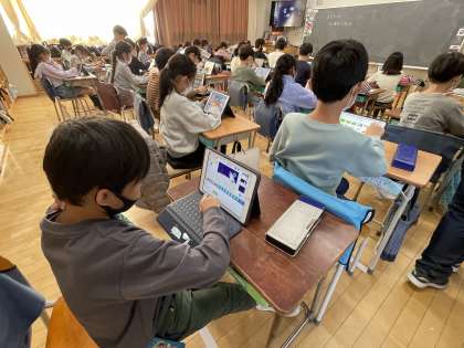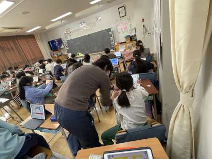 3年生が「スクラッチ」というアプリを使って、プログラミングを行っていました。