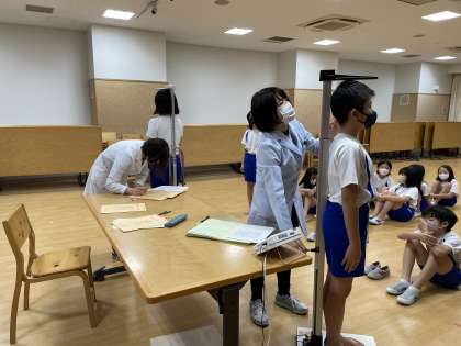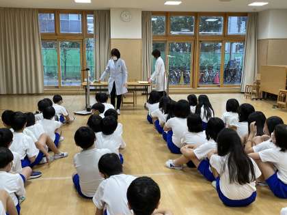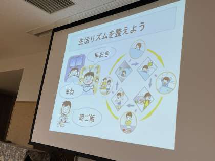 はじめに養護教諭から、規則正しい生活習慣についての話がありました。スライドを見ながら、自分の生活を見つめ直していました。