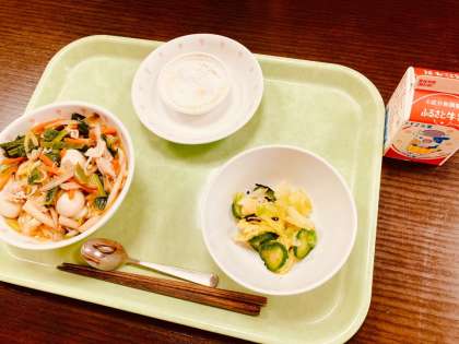 今日は、五目うどん、野菜の浅漬け、チーズケーキ、牛乳です。