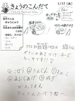 今月は3つの五目メニューがありますが、その中でリクエスト給食10位までに入っているのは、五目うどんだけのようです。私の大好きな、五目あんかけ焼きそばは入っていないのか。あんかけ焼きそばが入るように、願かけしていたのに。