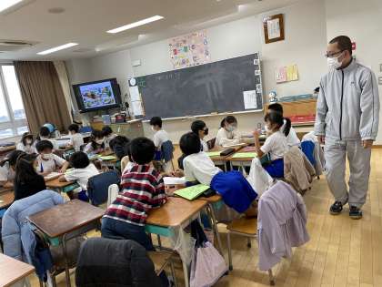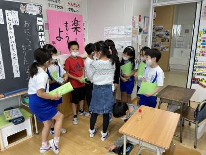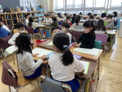 来週、町たんけんに行くために、グループを決めていました。自分が行きたいところで学年全体が分かれています。1組〜6組のクラスがそれぞれ集まっているので、初めて話す子もいます。学年で交流できるところも、今回の町たんけんのよさの一つです。