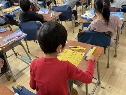 10のまとまりが10個集まって100になることをブロックを使って確かめていました。