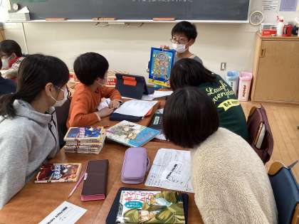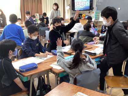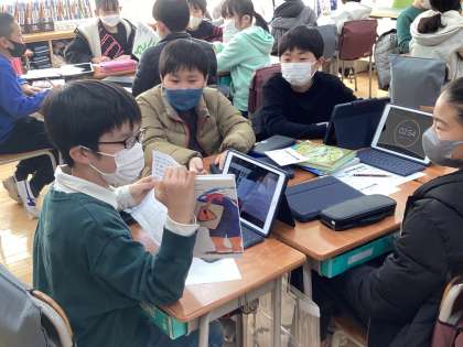 ビブリオバトルという単元で、子供たちそれぞれがおすすめの本を紹介していきます。みんなから「読んでみたい本」に選ばれるよう本のアピールを工夫していくという内容です。それぞれのクラスで思いい思いにお気に入りの本を紹介していました。
