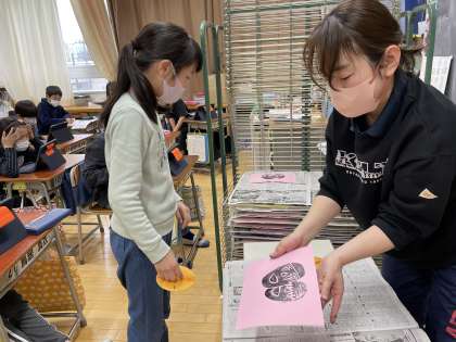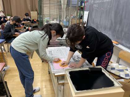 紙版画を刷っていました。先生と一緒に擦ります。紙をはがすと版がくっきりと写っていました。この版画がどのように仕上がるのでしょう。完成が楽しみです。