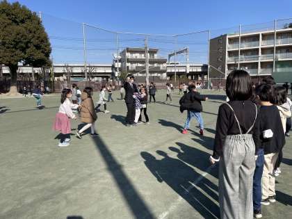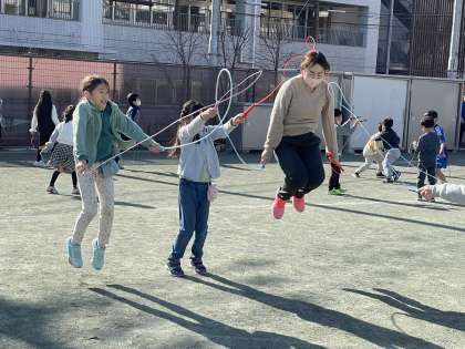 先生もおにごっこをしたり、縄跳びをしたり一緒に遊んでいました。縄跳び週間が来週から始まるので、縄跳びチャレンジカードが配られました。さっそく、たくさんの子が縄跳びをしていました。縄跳びブームが来ることでしょう。