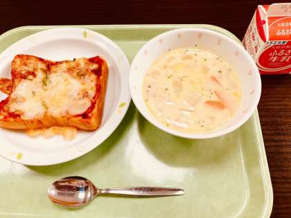 今日は、ピザトースト、野菜のクリームスープ、牛乳です。
