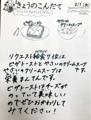 リクエスト給食第7位です。今月は、7位から5位までのメニューが出ます。リクエスト給食は、組み合わせをした献立の中から選んでいるのだそうなので、単品の順位ではないのだそうです。