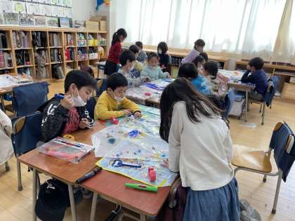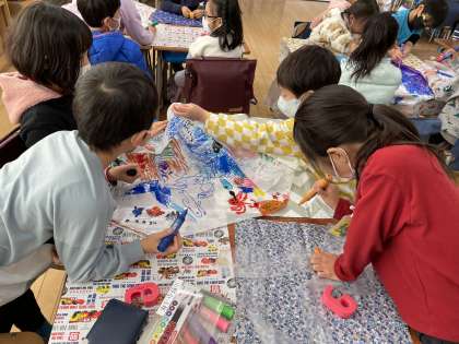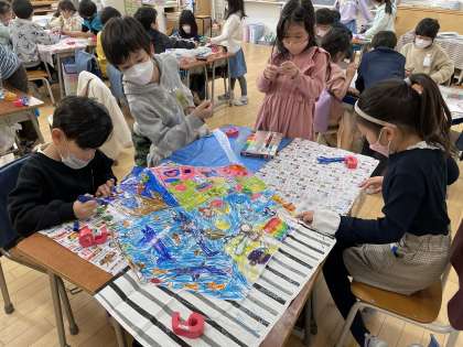 90Lのビニール袋を先生が「たこ」の形に切ってくれました。それにグループでテーマを決めて絵を描いていました。友達と話し合いながら何を描くかを決めて、とっても楽しそうに描いていました。