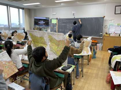 「畑が住宅地に変わっている!!」「果樹園がいっぱいある!!」と、地図から世田谷区の移り変わりを見つけていました。