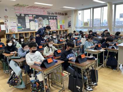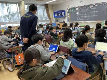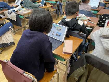先生が提示した資料から、世田谷区の移り変わりを考えていました。分かったことをロイロノートに打ち込んでいました。この後、一人一人の考えを共有して、友達の考えから学んでいきました。