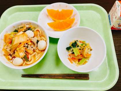 今日は、キムチうどん、野菜のナムル、せとか、牛乳です。