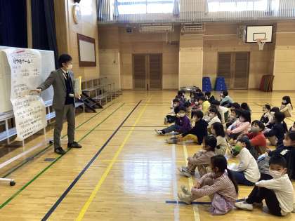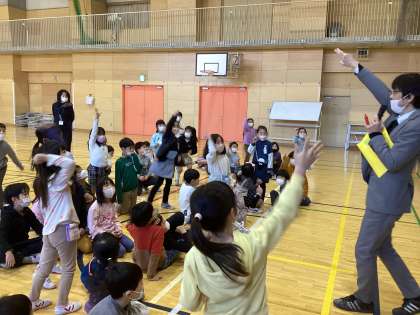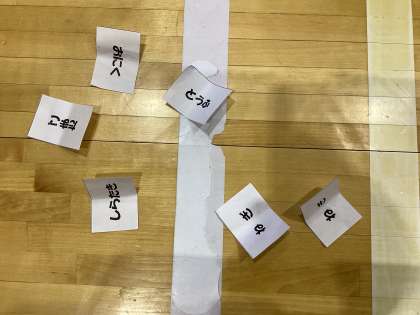 1年4組と6組の合同で「すき焼きじゃんけんゲーム」をしました。
