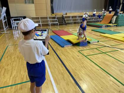 タブレットを使って、友達が跳び箱に挑戦しているところを撮影して、動きのポイントやよいところを確認していました。
