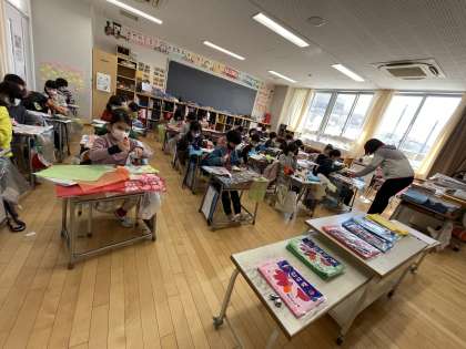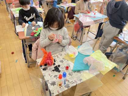 教室は、静まり返っていました。子供たちが作品作りに集中しているのです。お花紙やセロハンなどを丸めたり折ったりして、材料の感触を味わっていました。どんな作品になるのでしょう。。。