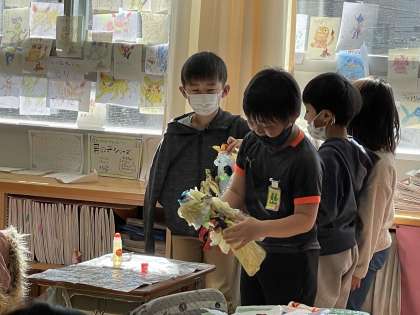 作品ができたかなと、しばらくしてから教室にいってみると、出来上がった作品で楽しそうに遊んでいました。作品作りでは、自分の世界に浸り、ひとたび終われば、友達と楽しむ。。。図工の授業の楽しさを存分に味わっていました。