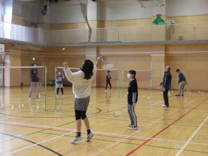 バドミントン教室では、最初に4種類の打ち方とコツを教えてもらい、最後は試合をやりました。この教室は、校長先生と6年の中村先生が指導者となっています。