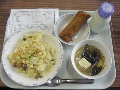 今日は、エビピラフ、牛乳、春巻き、わかめスープです。
