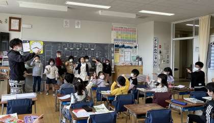 このクラスでは、今まで習った字を黒板に書いていました。1年生にとって、黒板にチョークで文字を書くことは、憧れの気持ちがあるようです。みんな書きたくて、たくさんの手が挙がっていました。黒板に書かれた漢字をみんなで確認したり、書き順を空書きしたりすることでも、漢字を覚えていくことができます。
