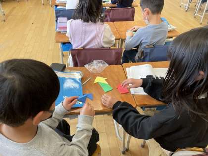 「かたち」の学習です。先生から「さんかくの形で家をつくりましょう。」と言われました。ペアになって、相談しながら、三角形を動かしていました。