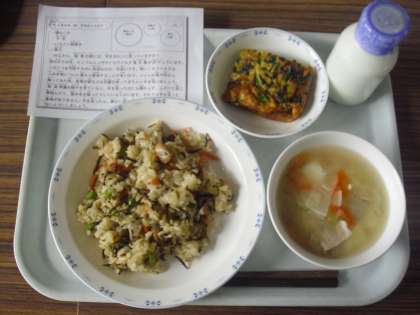 今日は、磯おこわ、牛乳、彩り卵焼き、豚汁です。