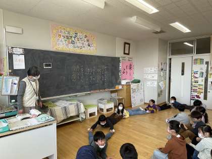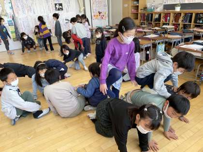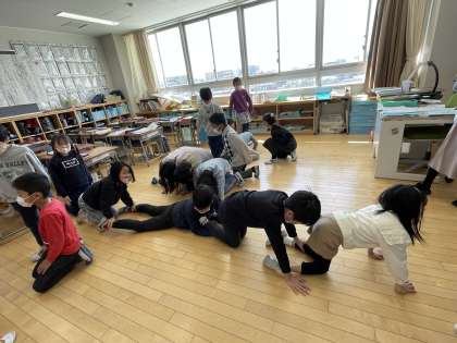 「いっぽんみちをあるいていたら」に出てくる登場人物のようすを体や姿勢や動きを工夫してグループで表現していました。