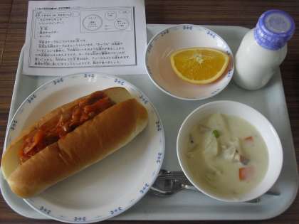 今日は、セルフウインナーサンド、牛乳、森のチャウダー、ネーブルです。