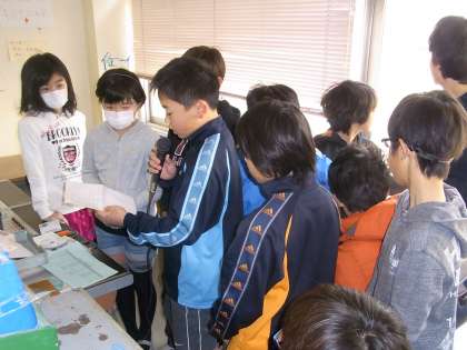 今日は体育館で児童集会の予定でしたが、インフルエンザの影響を考えて、放送による集会に急きょ変更になりました。「先生ビンゴ」をやりました。事前に配布したビンゴ用紙に、学校の先生の名前を書き入れておきます。集会委員会の児童が放送室で、引き当てた先生の名前を言っていきます。急な変更でしたが、集会委員のみんなはとても頑張っていました。