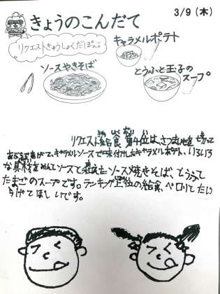 リクエスト給食の第4位です。そうすか。そうす焼きそばっすか。4位っすか。