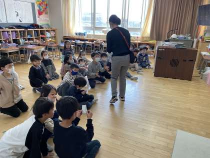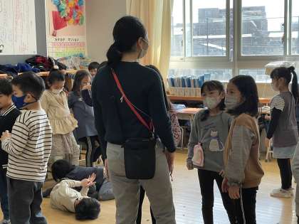 「いろいろなものになりきってみよう」の単元です。先生からグループにお題が渡されて、話し合ってそれを体で表現します。