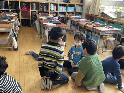 1年生とちょうど同じ時間に、体を使って表現していました。2年生は物語の登場人物になりきって、お話を表していました。どのグループも上手に話し合って工夫していました。